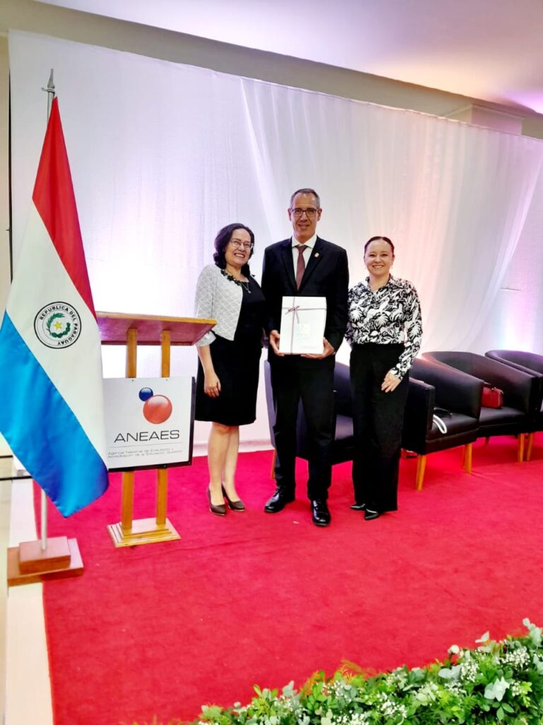 El Decano de la Facultad de Medicina, Dr. Claudio Diaz de Vivar; la Dra. Lourdes Chamorro, Directora de Residencias Médicas y la Mg. Ana Talavera, Directora de Aseguramiento de la Calidad, recibieron hoy, a las 10:00h, en el Salón Auditorio de la Agencia Nacional de Acreditación y Evaluación de la Educación Superior (ANEAES), los certificados de acreditación de los Programas de Postgrados.