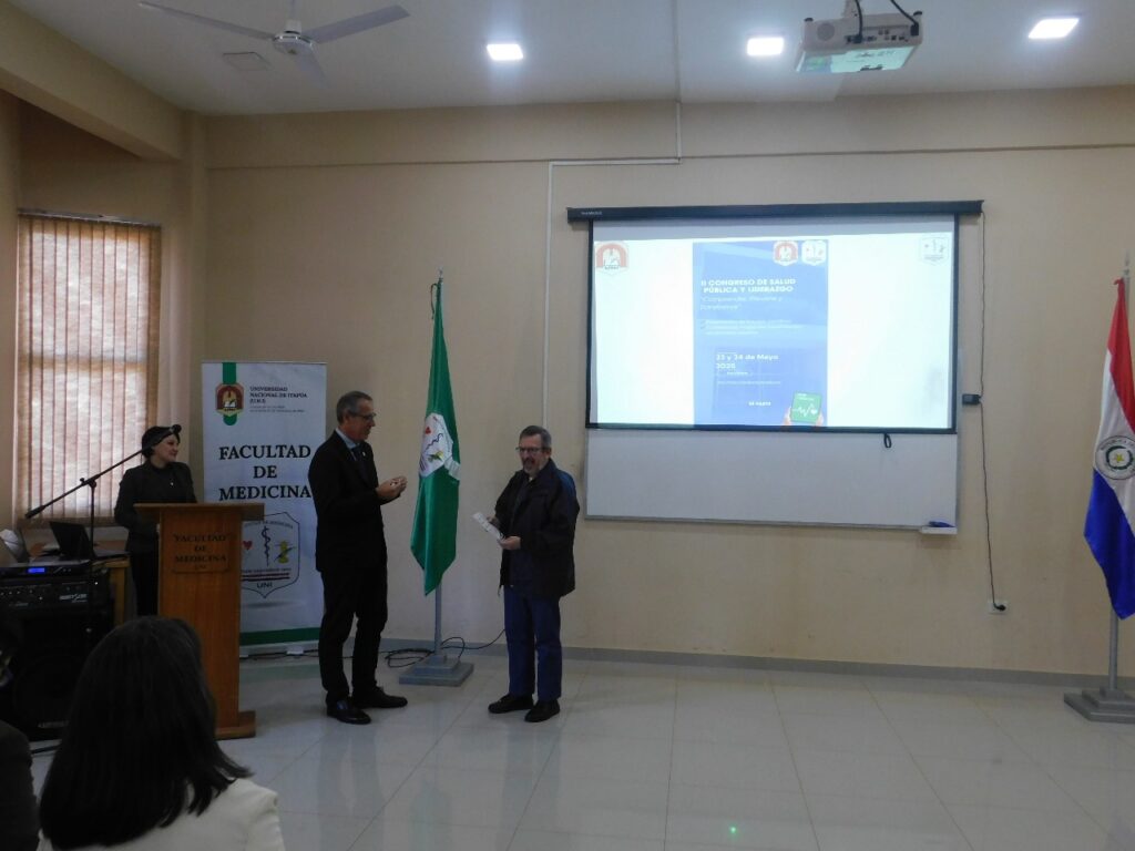 Al finalizar el conversatorio, se realizó un emotivo reconocimiento al Dr. Francisco Javier Arza, docente de la Facultad de Medicina, y a su esposa, la Sra. Martha Patiño, por su valioso aporte en el diseño de la identidad visual de la Facultad de Medicina. Ambos fueron autores del diseño original del logo institucional y, recientemente, llevaron a cabo su actualización. El reconocimiento fue recibido por el Dr. Arza, quien agradeció en nombre de ambos este homenaje.