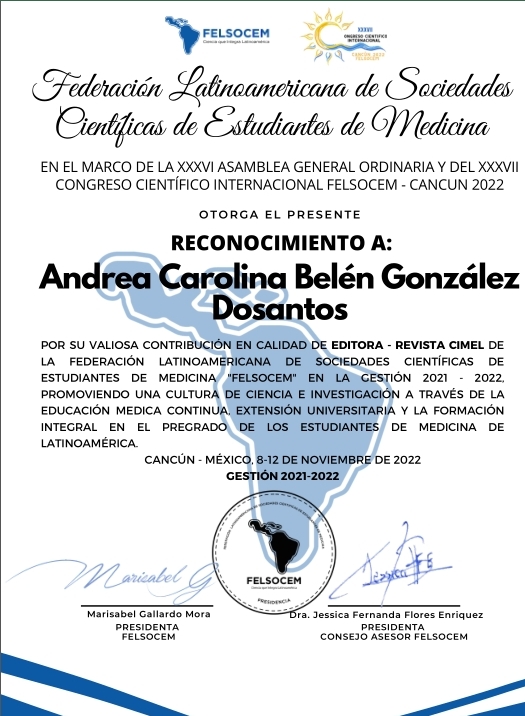 Las distinciones le fueron otorgadas por su valiosa contribución en calidad de Directora Internacional del Comité Permanente de Educación Médica y Editora de la Revista Científica Investigación Médico – Estudiantil de Latinoamérica CIMEL, de la Federación de Estudiantes de Medicina “FELSOCEM” en la gestión 2021 – 2022, promoviendo una cultura de ciencia e investigación a través de la educación médica continua, extensión universitaria y la formación integral en el pregrado de los estudiantes de medicina de Latinoamérica.