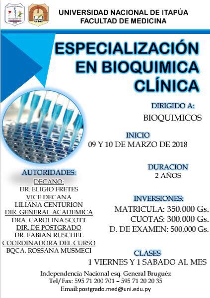 Con más de treinta matriculados, se inició el 09 de marzo de 2018, en el salón auditorio de la Facultad de Medicina de la Universidad Nacional de Itapúa, el  Curso de Especialización en Bioquímica Clínica.
