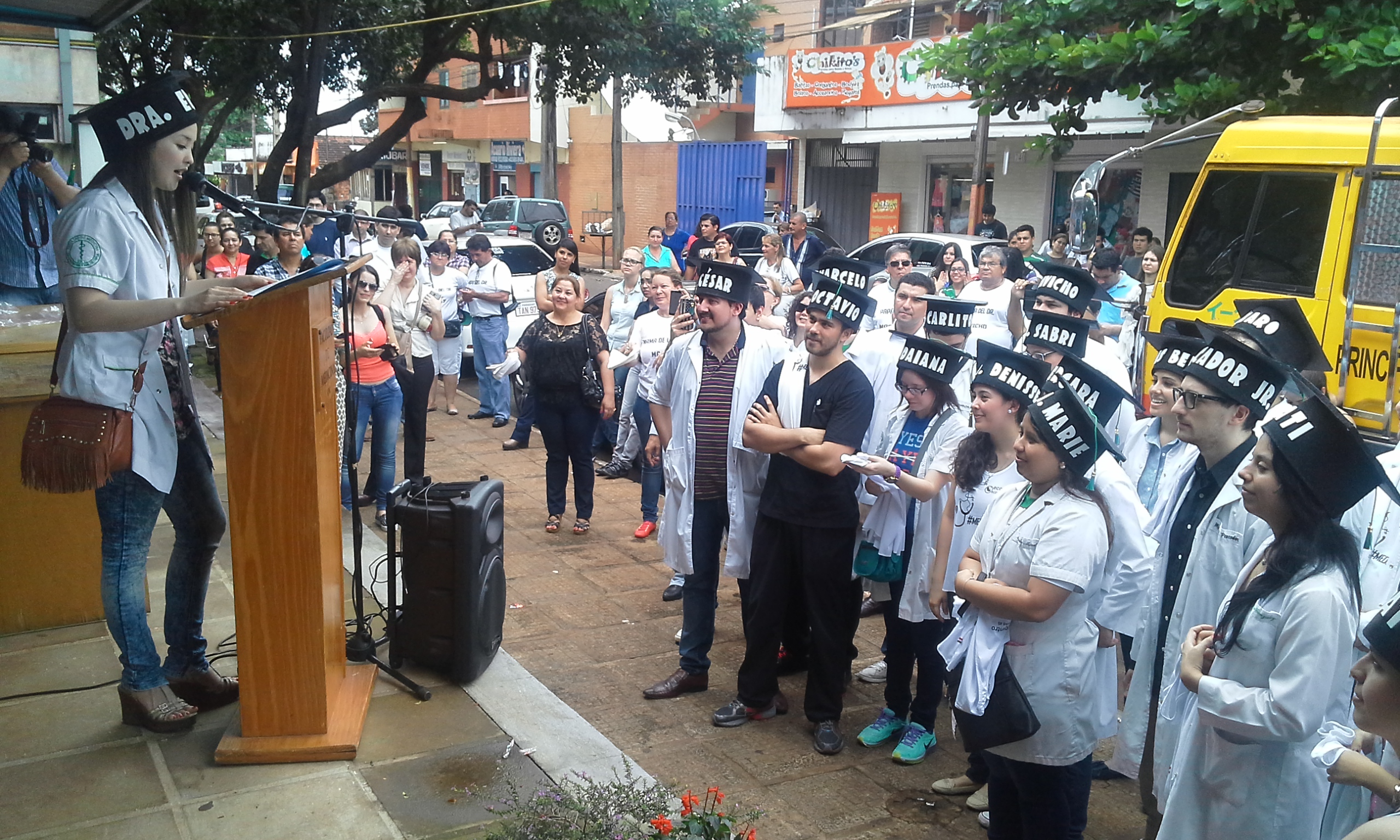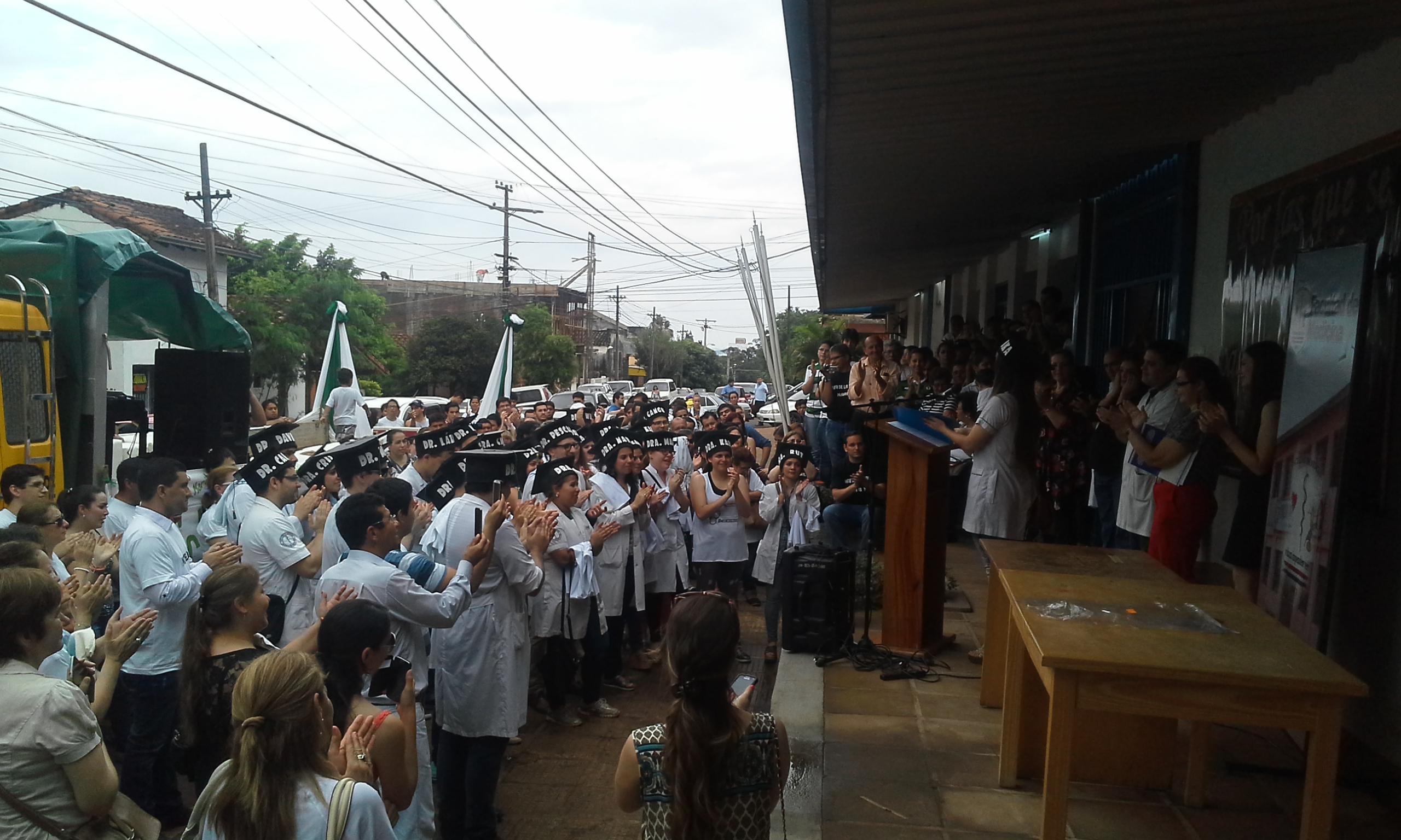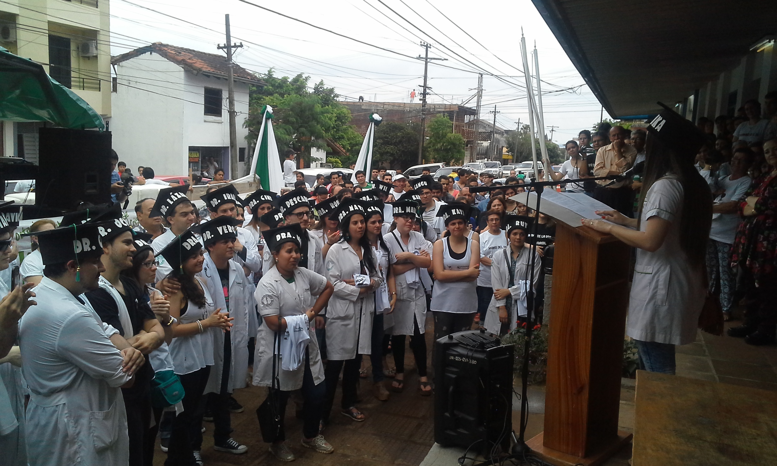 En medio de una gran algarabía, en la mañana de hoy, se realizó frente a la Institución el tradicional llamado de lista de los más de treinta nuevos Médicos Cirujanos de la Facultad de Medicina de la Universidad Nacional de Itapúa, Promoción 2015.