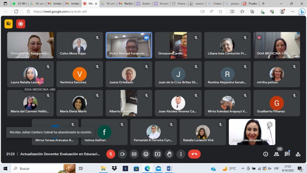 En el marco del Programa de Formación Continua para Docentes, los días 9 y 10 de octubre del año en curso en la modalidad virtual, se desarrolló el tema: “Evaluación del Proceso de Enseñanza y Aprendizaje”. La brillante disertación estuvo a cargo de la Mg. Eugenia Cyncar, Directora de Aseguramiento de la Calidad del Rectorado.