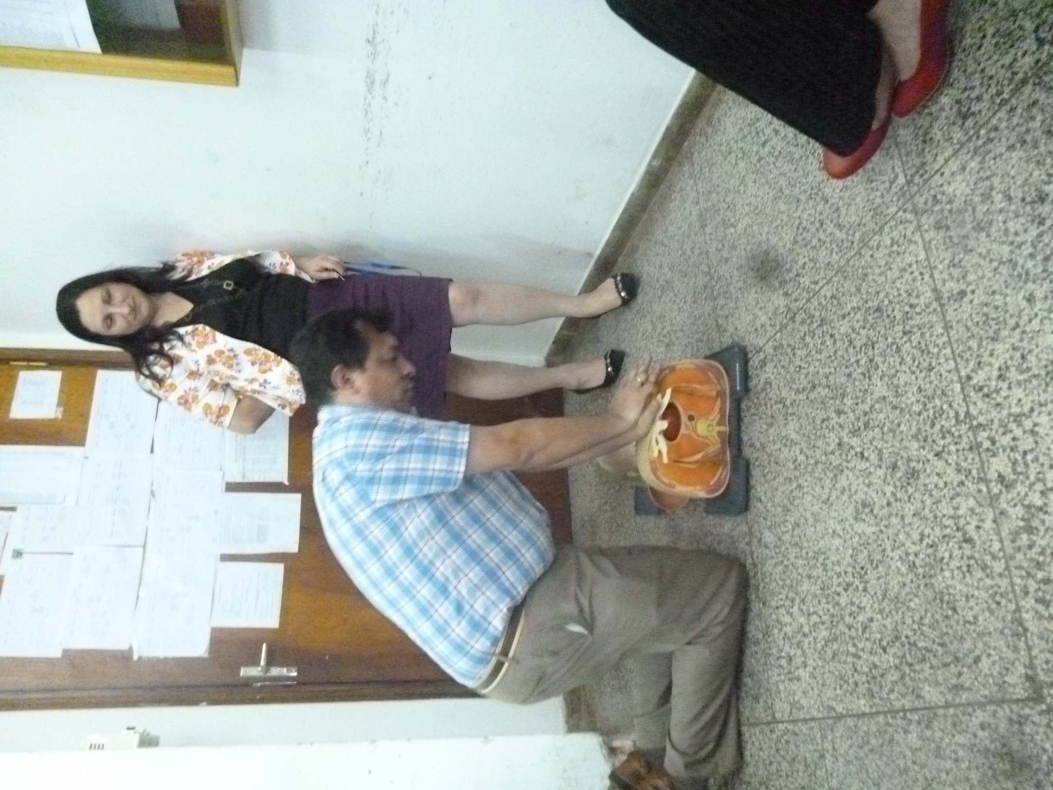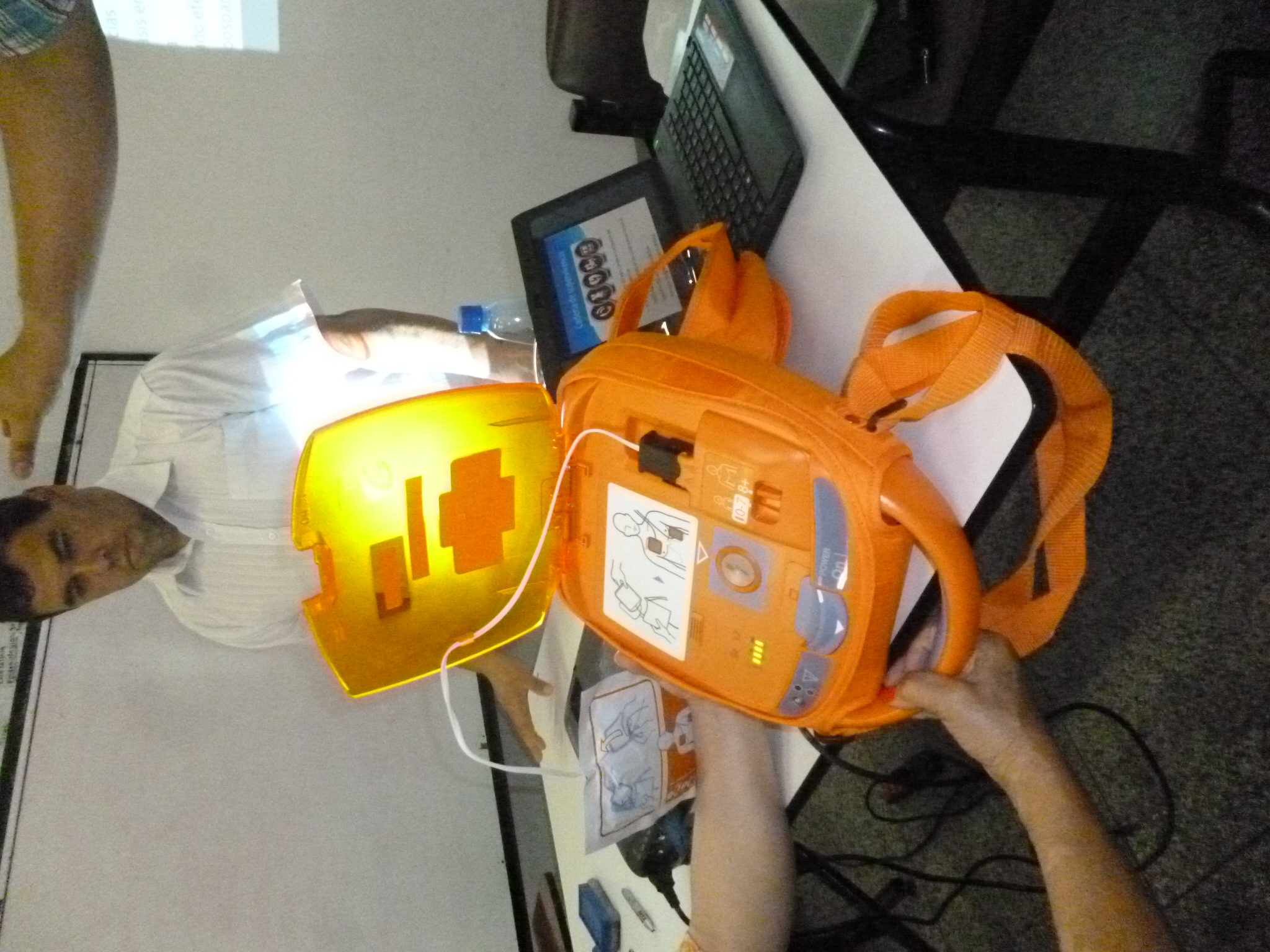 Seguidamente presentó a los participantes un desfibrilador externo automático (DEA) que es un dispositivo computarizado confiable y simple de operar que permiten tanto al lego o persona común como al personal de salud realizar la desfibrilación eléctrica de manera segura tanto para sí como para el paciente.